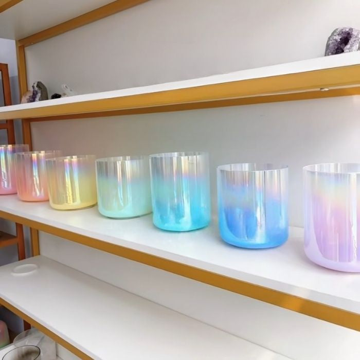 This high quality 7-piece crystal singing bowl chakra set is made from 99.9% pure quartz crystal and tuned to Octave 4 at 432Hz frequency.