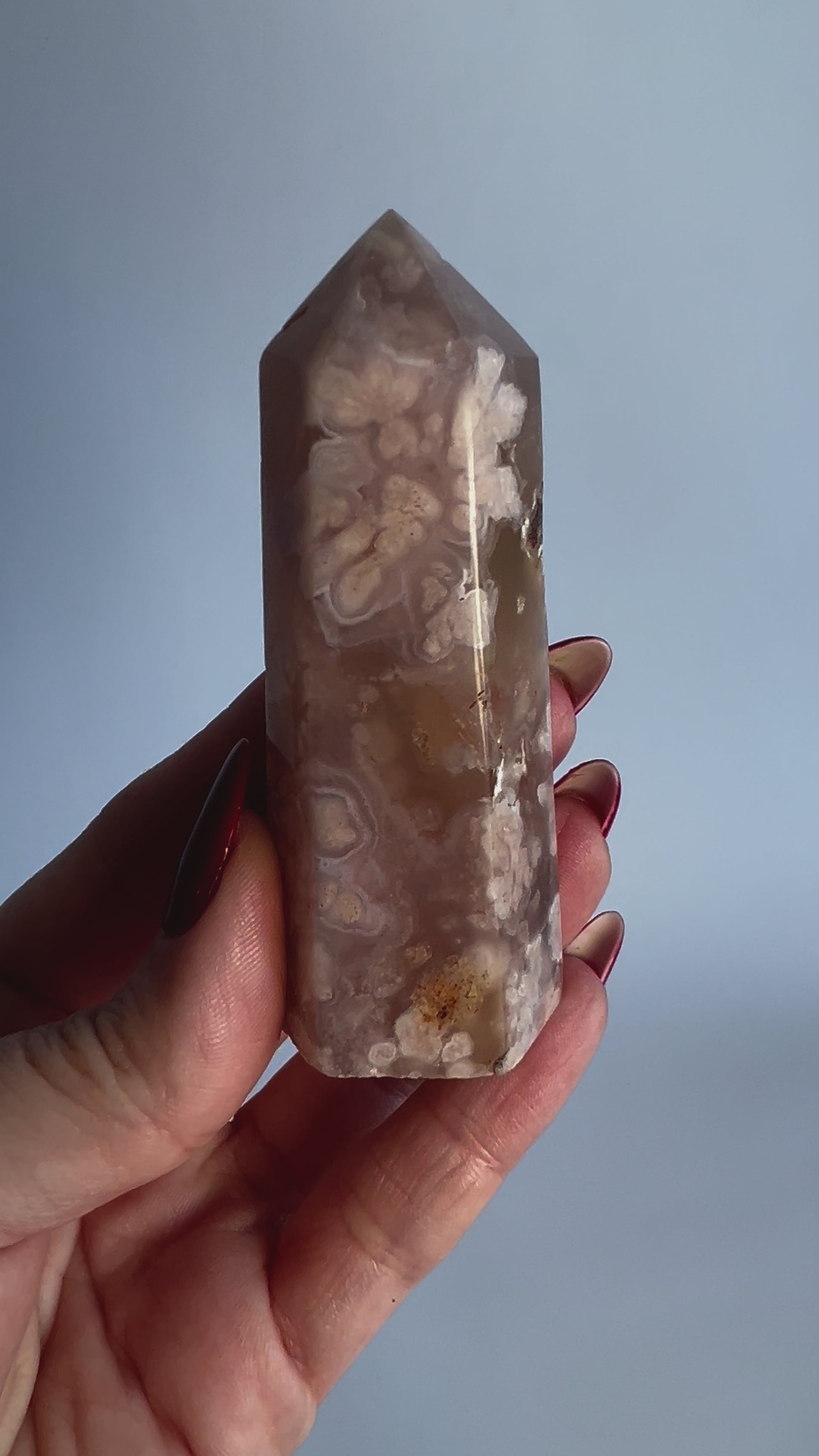 Flower Agate is a stone of personal growth. It helps us manifest our potential and overcome our fears. It emanates Divine Feminine energy that nurtures us and pushes us towards our full potential. Known to activate, open, and heal the Heart and Root Chakras, Flower Agate opens us to inspiration, creates inner peace, and fosters empathy.
